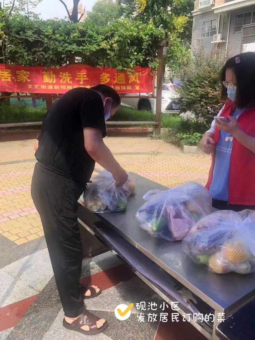 (水質(zhì)檢測中心房璐,在硯池社區(qū)為居民發(fā)放訂購的菜品,并做好核對登記工作)