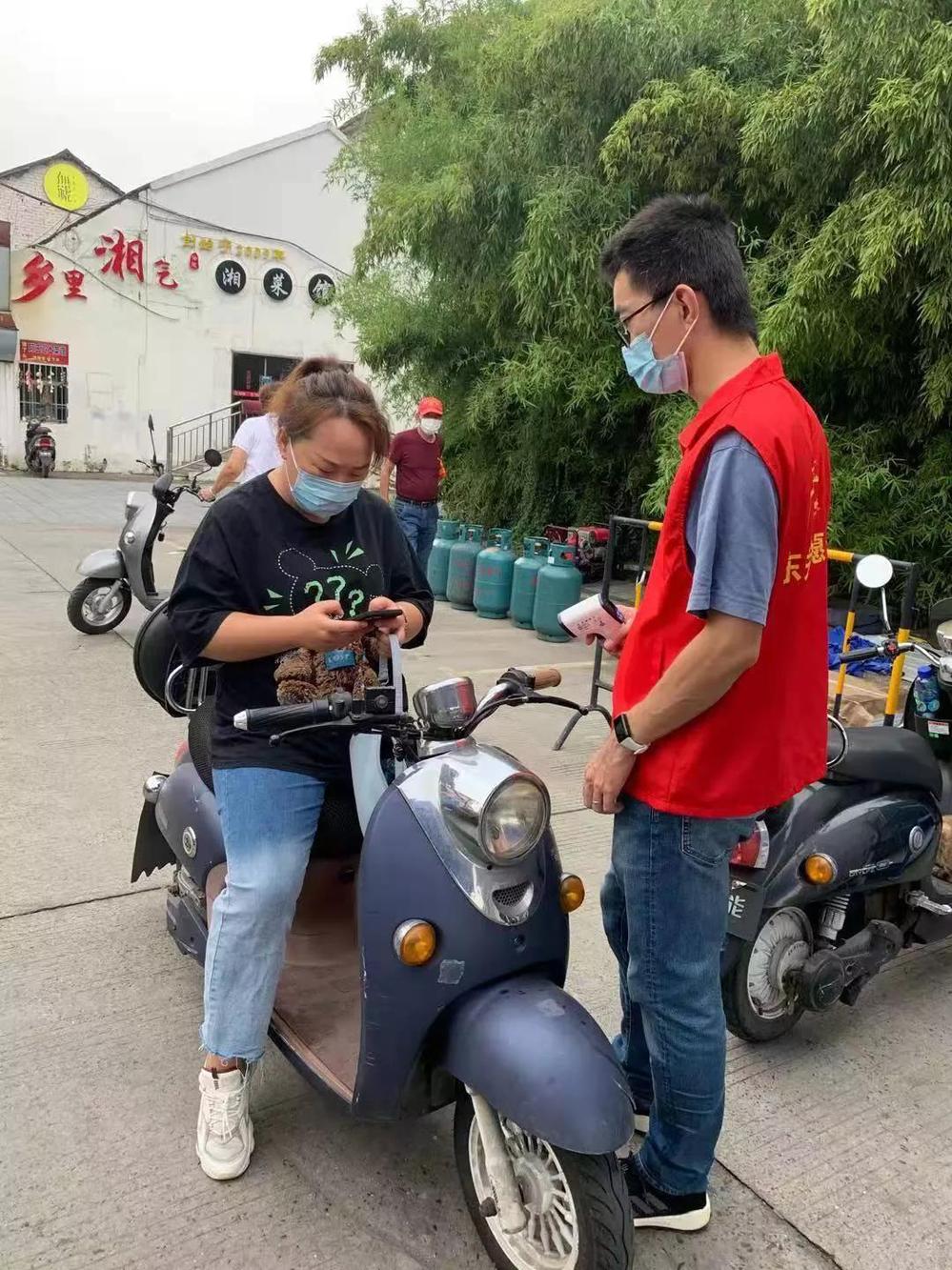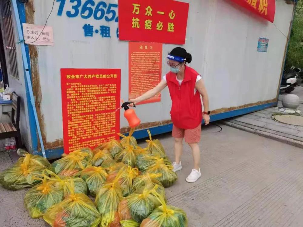 (水質(zhì)檢測中心吳靖在徐凝門社區(qū)為居民平價(jià)菜品進(jìn)行外包裝消毒,并做好居民勸導(dǎo)工作)