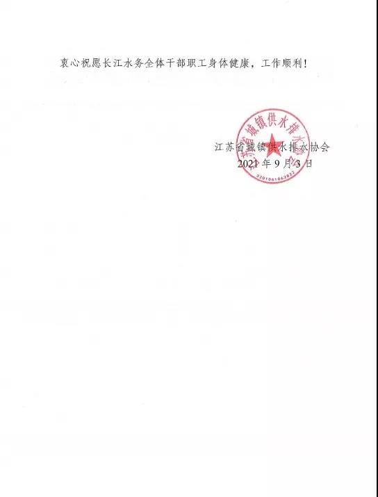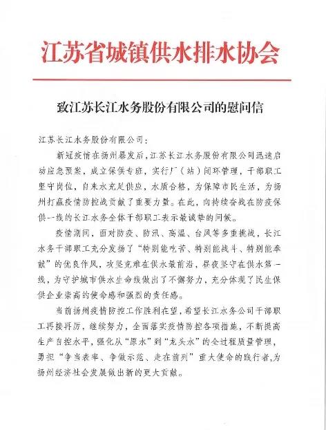 9月3日,長江水務(wù)收到江蘇省城鎮(zhèn)供水排水協(xié)會發(fā)來的慰問信,慰問信寫道:疫情期間揚州自來水充足供應(yīng),水質(zhì)合格,長江水務(wù)為保障市民生活,為揚州打贏疫情阻擊戰(zhàn)貢獻了重要力量,充分體現(xiàn)了民生保供企業(yè)崇高的使命感和強烈的責(zé)任感。省水協(xié)通過慰問信的方式,向持續(xù)奮戰(zhàn)在防疫保供一線的長江水務(wù)全體干部職工表示最誠摯的問候。
