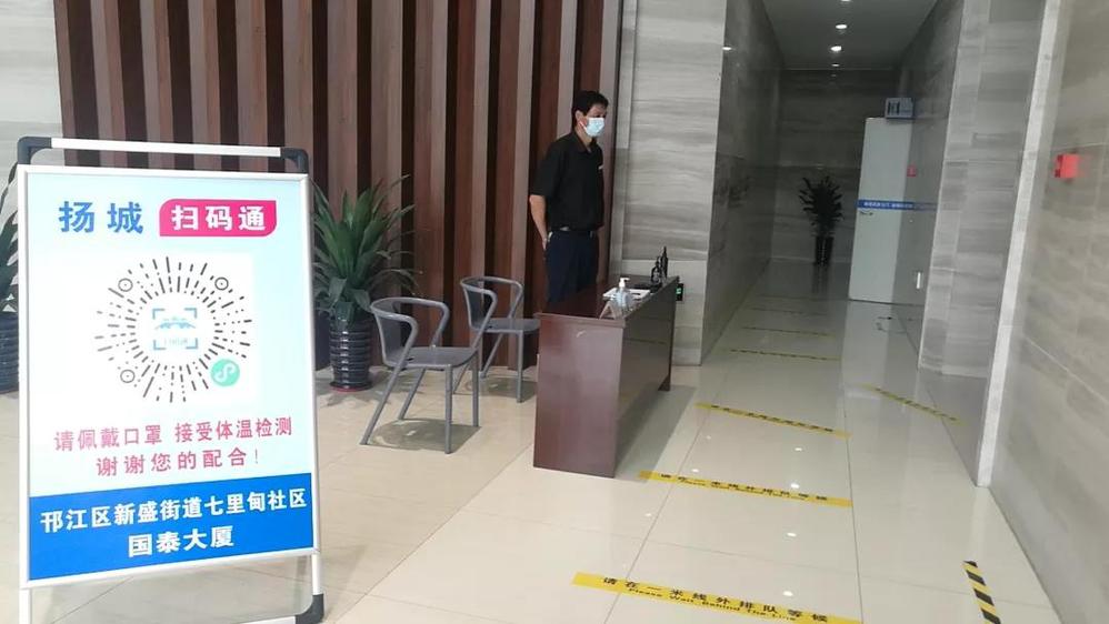 接到可以辦理復(fù)工復(fù)產(chǎn)的通知后,國泰物管處一邊迅速按照屬地防疫指揮部要求,制定了疫情防控預(yù)案,并完成資料申報;一邊抓緊對大廈進(jìn)行了一系列防控措施的現(xiàn)場部署。9月4日,現(xiàn)場完成了5臺“揚城掃碼通”一體機的安裝,在各出入口張貼了二維碼,同時做好出入口防控崗人員的崗前培訓(xùn),尤其是熟練掌握一體機的使用和故障排查培訓(xùn),以便保障有序通行;9月5日上午,關(guān)停地下車庫電梯,完成通道導(dǎo)行標(biāo)識張貼,同時根據(jù)反復(fù)規(guī)劃的合理線路,除預(yù)留的2個消防通道外,其余出入口全部封閉;9月5日下午,完成地面一米線布設(shè),為有序掃碼和乘坐電梯做好準(zhǔn)備。疫情防控期間,所有進(jìn)入大廈的工作人員需按照指引,從規(guī)定入口和通道通行,并需經(jīng)過“揚城掃碼通”、現(xiàn)場登記、自動測溫三道關(guān),才能進(jìn)入大廈內(nèi)。