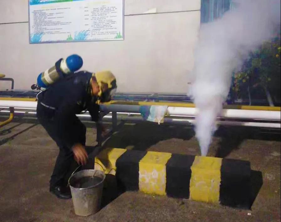 當晚10時許,演練正式開始。只見場站內濃煙滾滾,這是模擬卸車柱液相管發(fā)生管道泄漏。發(fā)現(xiàn)異常情況后,夜間值班人員背負正壓呼吸器,迅速趕到現(xiàn)場,在查看到泄漏點位置后,立即到安全區(qū)域向有關負責人報告。參演人員得到指令,按照預案奔赴現(xiàn)場,接上消防水帶,打開消防栓啟動消防泵,調整蓮花頭,以霧狀水幕稀釋泄漏點周邊液化氣濃度。隨后,搶修人員趕到,用堵漏卡箍與濕布,對管道泄漏點進行堵漏。堵漏完成后,對泄漏點檢測,確保無泄漏后,做進一步處理。
