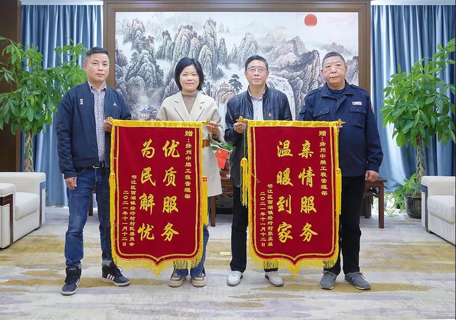 11月16日,邗江區(qū)西湖鎮(zhèn)經(jīng)圩村村委會、經(jīng)圩村張莊組代表來到揚(yáng)州中燃公司,送來印有“優(yōu)質(zhì)服務(wù)、為民解憂”“親情服務(wù)、溫暖到家”兩面錦旗,以表達(dá)對公司在施工過程中想方設(shè)法、協(xié)調(diào)矛盾、規(guī)范高效、為民解憂的誠摯感謝。