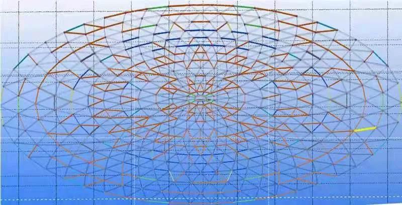 該鋼結(jié)構(gòu)穹頂屬于網(wǎng)殼結(jié)構(gòu),由鋼管桿件構(gòu)成68個單元模塊,四周環(huán)繞12個樹狀結(jié)構(gòu)支撐,自重約440t,呈橢圓型,長軸92m,短軸51m。