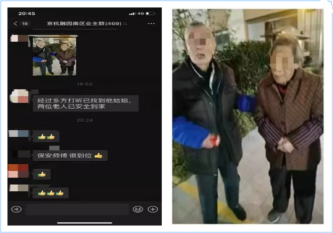 原來(lái),兩位老人是一對(duì)夫妻,都年近九旬了。不知道怎么的,下樓后就迷路了,記不清自己住哪里,也說(shuō)不出樓棟門牌號(hào),正兜兜轉(zhuǎn)轉(zhuǎn)尋找回去的路。為幫助老兩口盡快找到家人,值班隊(duì)長(zhǎng)和隊(duì)員們一邊安撫老人情緒,耐心尋問(wèn)老人家的情況,一邊把尋人信息發(fā)到各業(yè)主群里,請(qǐng)居民幫忙辨認(rèn)。