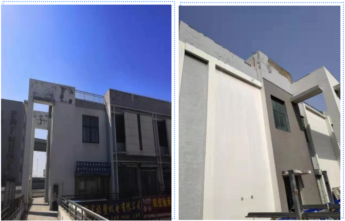 由分管領(lǐng)導(dǎo)牽頭,工程處、監(jiān)管處以及通運(yùn)商貿(mào)城營(yíng)運(yùn)部共同協(xié)作,經(jīng)過(guò)前期多輪現(xiàn)場(chǎng)查勘和方案討論,最終從安全、美觀、經(jīng)濟(jì)等多方面考量,確定了整改方案并落實(shí)了施工單位進(jìn)場(chǎng)施工,清除原剝落墻體的外墻瓷磚,做好防水保護(hù)等措施,采用彈性外墻涂料進(jìn)行粉刷出新。