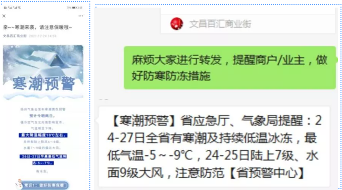 文昌百匯企劃部立刻撰寫“防寒防凍溫馨提示”,在微信公眾號和業(yè)主群同步發(fā)布,增強業(yè)主、商戶防寒防凍意識,督促業(yè)主、商戶及時落實應對措施,做好自身防護;同時提醒業(yè)主注意用電用水安全。