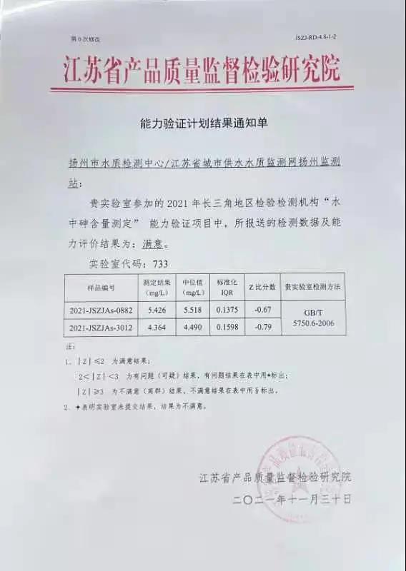 日前,長江水務(wù)公司水質(zhì)檢測中心先后獲得國家生態(tài)環(huán)境部、江蘇省產(chǎn)品質(zhì)量監(jiān)督檢驗(yàn)研究院頒發(fā)的CMA實(shí)驗(yàn)室能力驗(yàn)證結(jié)果滿意證書。