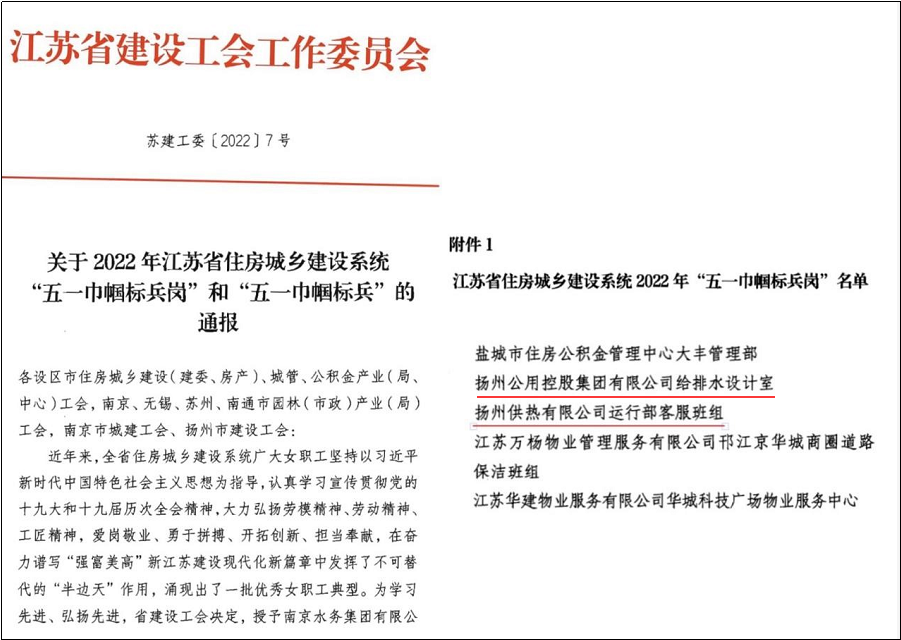 近日,江蘇省建設(shè)工會(huì)委員會(huì)下發(fā)《關(guān)于2022年江蘇省住房城鄉(xiāng)建設(shè)系統(tǒng)“五一巾幗標(biāo)兵崗”和“五一巾幗標(biāo)兵”的通報(bào)》,揚(yáng)州公用控股集團(tuán)有限公司給排水設(shè)計(jì)室、供熱公司運(yùn)行部客服班組榮獲“五一巾幗標(biāo)兵崗”稱號(hào)。