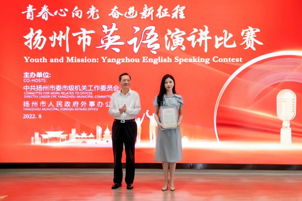 8月20日上午,在揚州市委市級機關(guān)工委與揚州市人民政府外事辦公室聯(lián)合舉辦的“青春心向黨,奮進(jìn)新征程”2022年揚州市英語演講比賽決賽中,城控集團本部李韻秋同志和建盛公司張輝同志分別榮獲特等獎和優(yōu)秀獎。