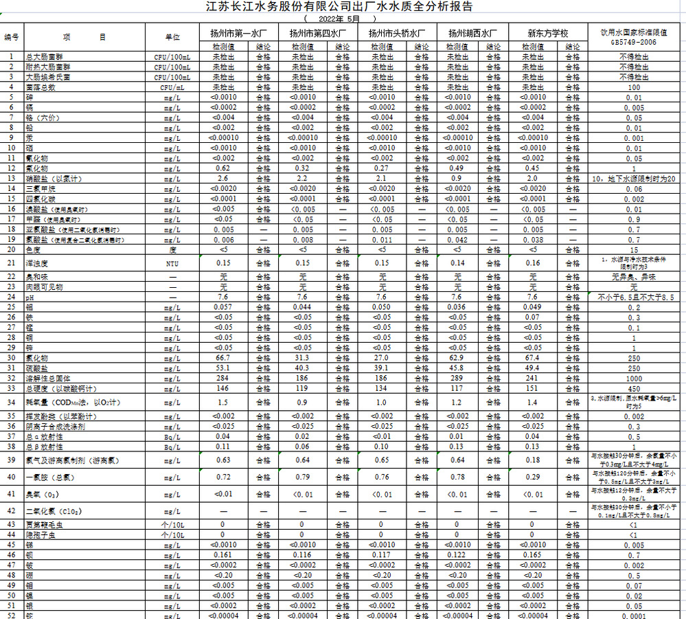 江蘇長(zhǎng)江水務(wù)股份有限公司出廠(chǎng)水水質(zhì)全分析報(bào)告 ( 2022年 5月 )