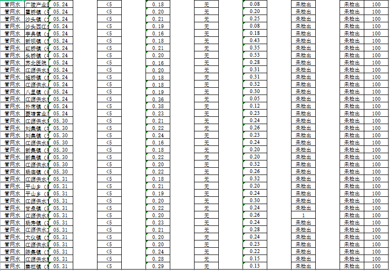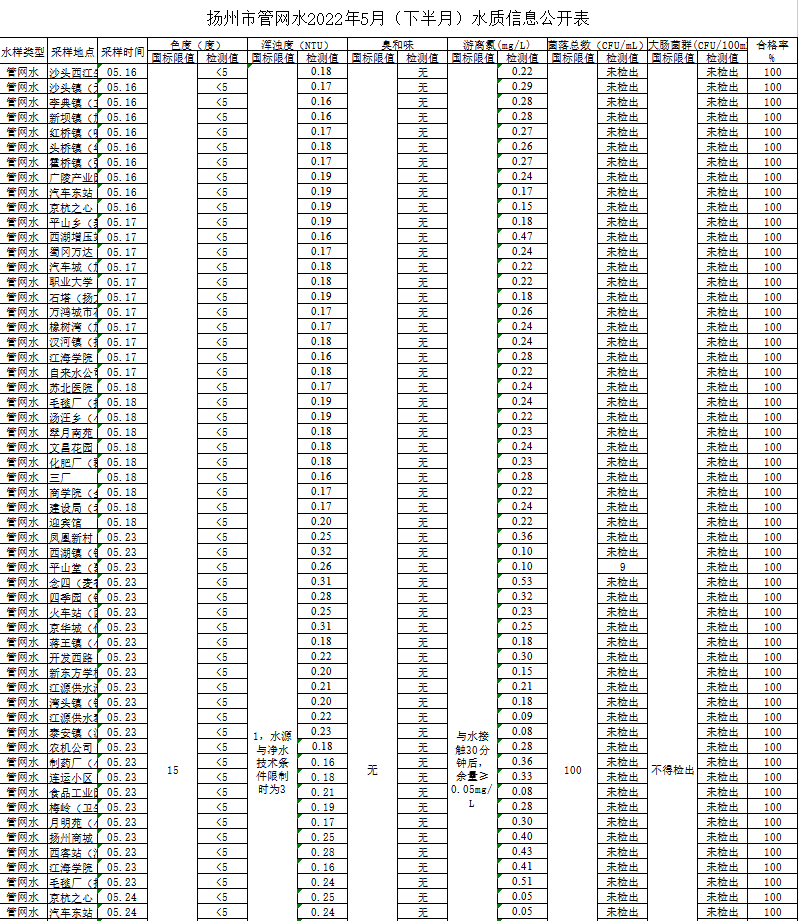 揚(yáng)州市管網(wǎng)水2022年5月(下半月)水質(zhì)信息公開(kāi)表