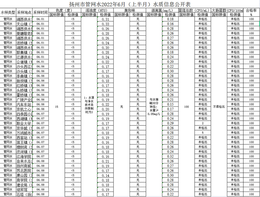 揚(yáng)州市管網(wǎng)水2022年6月(上半月)水質(zhì)信息公開(kāi)表