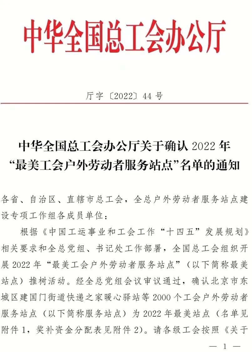 近日,中華全國總工會辦公廳發(fā)布2022年“最美工會戶外勞動者服務站點”名單,城控集團公用事業(yè)服務中心——長江水務寶帶營業(yè)廳工會戶外勞動者服務站點名列其中,這是揚州市總工會建設產業(yè)系統唯一一家入選的服務站點。