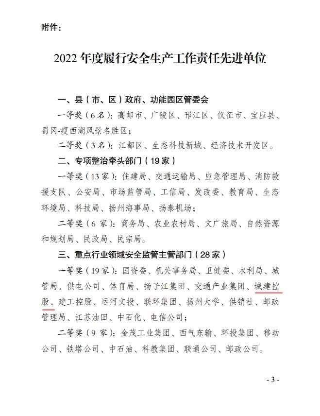 2022年,城控集團深入貫徹落實習(xí)近平總書記關(guān)于安全生產(chǎn)重要思想論述,堅守“生命至上、安全發(fā)展”理念,全面落實安全生產(chǎn)責(zé)任,強化工作舉措,順利完成市安委會下達的目標任務(wù),被表彰為2022年度履行安全生產(chǎn)工作責(zé)任先進單位一等獎。