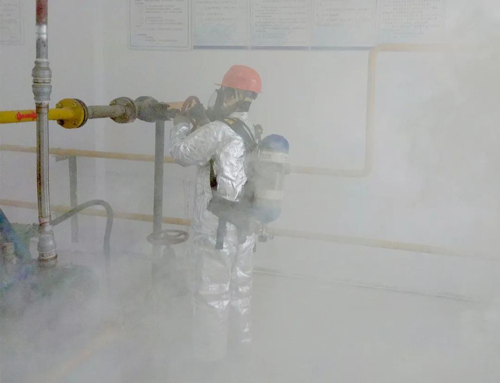 第二階段演練模擬壓縮機房發(fā)生泄漏。演練人員先切斷所有電源,關閉閥門,疏散無關人員。上報公司后,組織人員迅速穿戴防護服與正壓式呼吸器進入現(xiàn)場,在判定為法蘭連接處為泄漏點后,使用不發(fā)火工具,對泄漏部位進行搶修,再使用可燃氣體檢漏儀對泄漏點進行檢查,確保無泄漏。