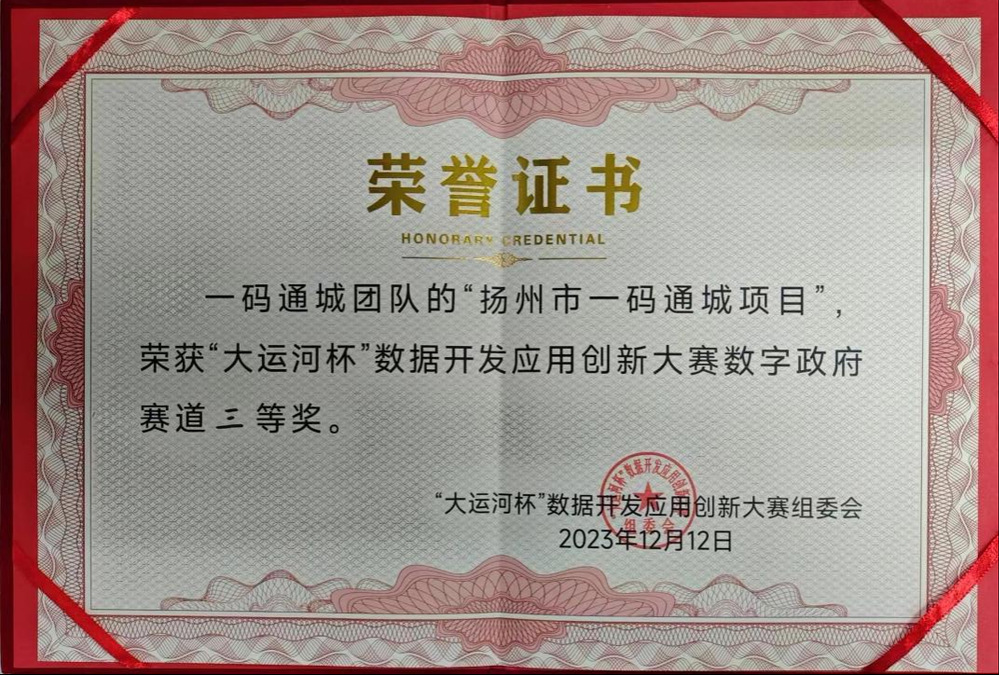 今年9月起,揚州市大數(shù)據(jù)管理局舉辦 “2023年‘大運河杯’數(shù)據(jù)開發(fā)應(yīng)用創(chuàng)新大賽”,由江蘇省大數(shù)據(jù)管理中心、江蘇大數(shù)據(jù)聯(lián)盟指導(dǎo),揚州市發(fā)改委、工信局聯(lián)合主辦。大賽主題為“江河融慧好地方 數(shù)聚賦能新發(fā)展”,設(shè)4個賽道,其中數(shù)字政府賽道設(shè)一等獎1名、二等獎3名、三等獎6名。大賽共吸引全國180支團隊、396位數(shù)字人才報名,在12月12日決賽中,市民卡公司“揚州市一碼通城項目”榮獲“大運河杯”數(shù)據(jù)開發(fā)應(yīng)用創(chuàng)新大賽數(shù)字政府賽道三等獎。