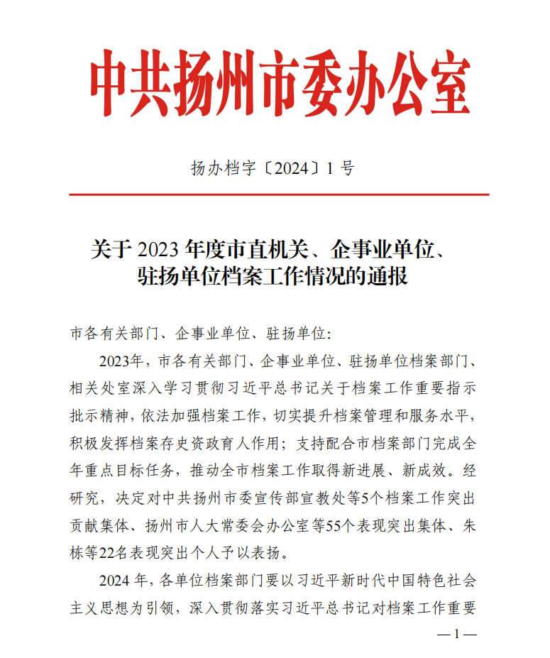 新年伊始,城控集團(tuán)檔案工作迎來開門紅!揚(yáng)州市委辦公室發(fā)文《關(guān)于2023年度市直機(jī)關(guān)、企事業(yè)單位、駐揚(yáng)單位檔案工作情況的通報(bào)》,城控集團(tuán)獲評“2023年度檔案工作表現(xiàn)突出集體”。
