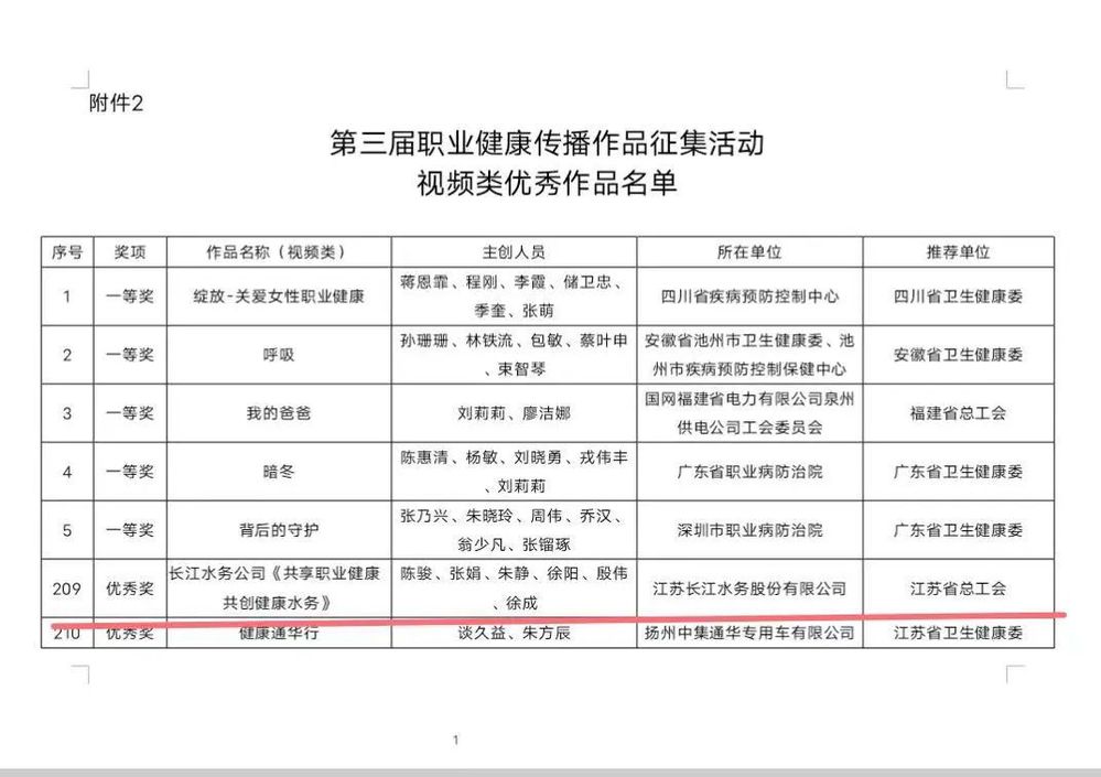 江蘇長江水務(wù)股份有限公司將以此次獲獎(jiǎng)為契機(jī),圍繞職業(yè)健康重點(diǎn)工作不斷提升職工職業(yè)健康素養(yǎng)水平,創(chuàng)作出更多的精彩作品,積極傳播職業(yè)健康知識(shí),傳遞健康工作理念,為營造全社會(huì)關(guān)注職業(yè)健康的濃厚氛圍做出更多貢獻(xiàn)!