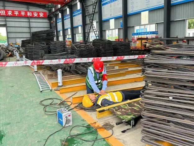此次演練分為基坑坍塌視頻培訓(xùn)、高溫中暑桌面演練、觸電救援實操演練三個環(huán)節(jié)進(jìn)行。其中,實操演練模擬拖地電線造成一名鋼筋工觸電?,F(xiàn)場指揮、警戒疏散、醫(yī)療救護(hù)、事故調(diào)查、通訊聯(lián)絡(luò)等工作小組按照應(yīng)急救援方案快速響應(yīng),依次有序開展救援工作。