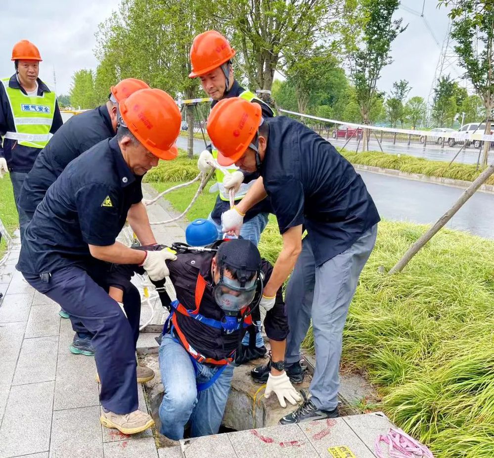 演練模擬燃氣閥門井維護過程作業(yè)人員中毒窒息。在閥門井維護作業(yè)過程中,井下作業(yè)人員突感身體不適、呼吸不暢,不能自救,立即通知井外監(jiān)護人員施救。井外監(jiān)護人員立即報告現(xiàn)場搶維修組長,啟動應急預案,開展應急救援。設立警戒線,啟動排風機強制驅(qū)散井內(nèi)有毒有害氣體,手持四合一便攜式檢漏儀不間斷監(jiān)測井內(nèi)有毒有害氣體濃度,穿戴正壓式呼吸器準備下井。待井內(nèi)有毒有害氣體濃度恢復正常時,救護人員穿著防護服下井施救,在井內(nèi)和井外人員全力配合下,成功救出受困人員。