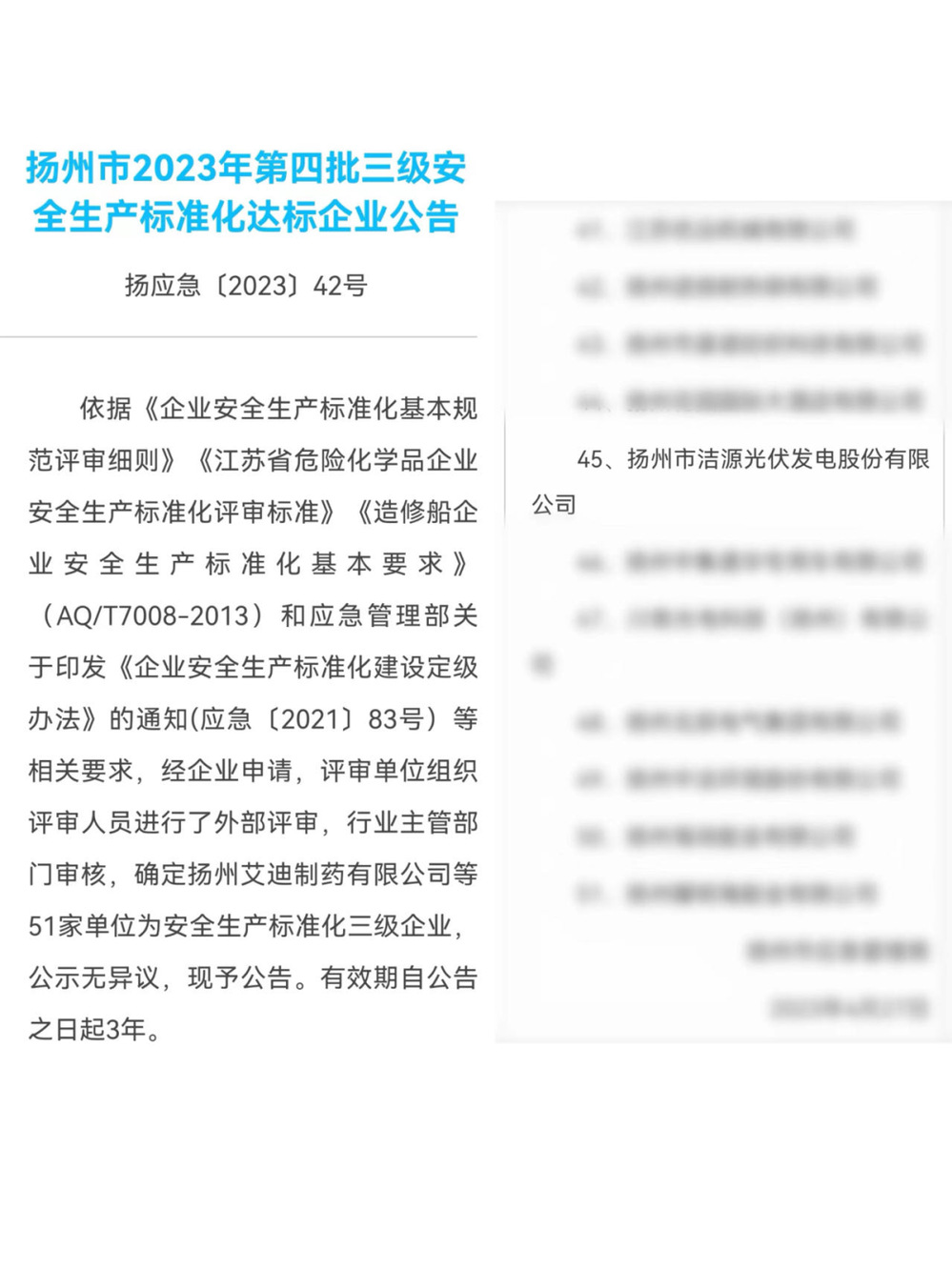安全生產(chǎn)持續(xù)穩(wěn)定。持續(xù)強(qiáng)化設(shè)備檢修、高空作業(yè)、工程施工等重點部位的安全管控,細(xì)致做好光伏電站電氣設(shè)備和消防設(shè)施的隱患排查整治工作,并從安全目標(biāo)管理、隱患排查治理、職業(yè)健康管理、安全培訓(xùn)和應(yīng)急管理等要素入手,全面推進(jìn)安全生產(chǎn)標(biāo)準(zhǔn)化建設(shè),于2023年4月獲評揚(yáng)州市三級安全生產(chǎn)標(biāo)準(zhǔn)化達(dá)標(biāo)企業(yè),自成立以來未發(fā)生一起安全生產(chǎn)責(zé)任事故。