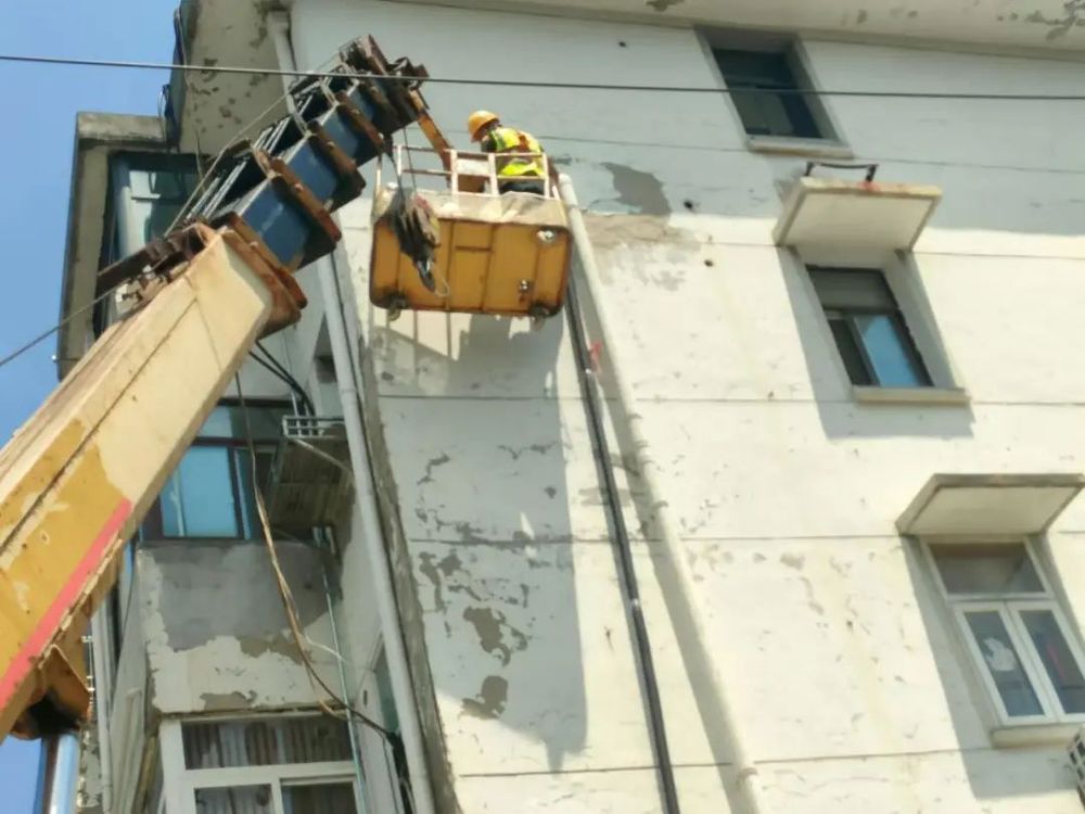 中午12點,施工人員頂烈日、冒酷暑,身著安全服裝、頭戴安全帽進(jìn)入現(xiàn)場。漏水的是距離地面約15米左右高度的DN20PE進(jìn)戶管,由于現(xiàn)場無法搭腳手架,又調(diào)來掛籃吊車進(jìn)行高空作業(yè),在制定好具體方案后實施搶修。