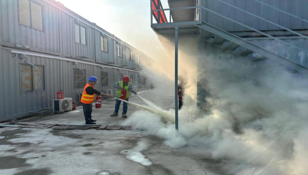 本次培訓(xùn)邀請(qǐng)消防安全專家進(jìn)行授課。演練前,專家詳細(xì)講解了火災(zāi)報(bào)警流程、初期火災(zāi)撲救技巧、疏散逃生注意事項(xiàng)等核心知識(shí),重點(diǎn)演示了滅火器“提、拔、握、壓”的正確操作方法,同時(shí)明確了疏散引導(dǎo)員、滅火行動(dòng)組的職責(zé)分工,劃定了安全疏散路線和集合區(qū)域。下午2時(shí)30分,演練正式啟動(dòng)。模擬火情信號(hào)發(fā)出后,集裝箱板房?jī)?nèi)煙霧彌漫,現(xiàn)場(chǎng)立即啟動(dòng)應(yīng)急響應(yīng)預(yù)案。疏散引導(dǎo)員迅速組織員工用濕毛巾捂住口鼻,彎腰低姿沿預(yù)定路線快速、有序撤離至指定安全區(qū)域;滅火行動(dòng)組攜帶滅火器、消防水帶等器材,第一時(shí)間趕赴“火情”現(xiàn)場(chǎng),對(duì)著火點(diǎn)實(shí)施精準(zhǔn)撲救。